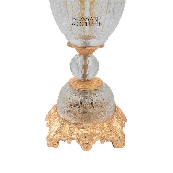 Elegant golden brass and crystal decorative vase with ornate carved base and intricately designed transparent glass body