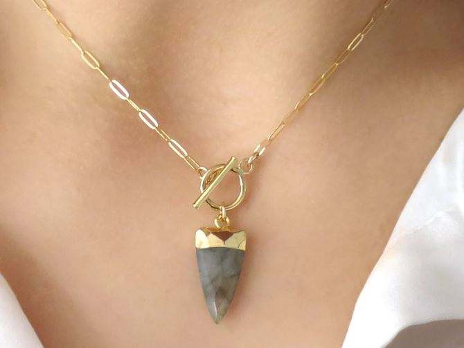 Elegant jewelry natural fire labradorite pendant toggle clasp necklace brass 18k gold plated paperclip chain statement necklace