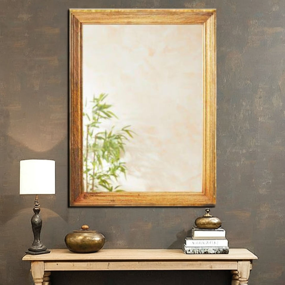 Elegant large wooden wall mirror frame for bedroom or living room with antique distressed finish and bold rustic charm