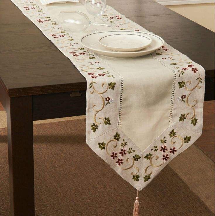 Elegant linen table runners with intricate embroidery work suitable for wedding dining table setups festive banquets homes