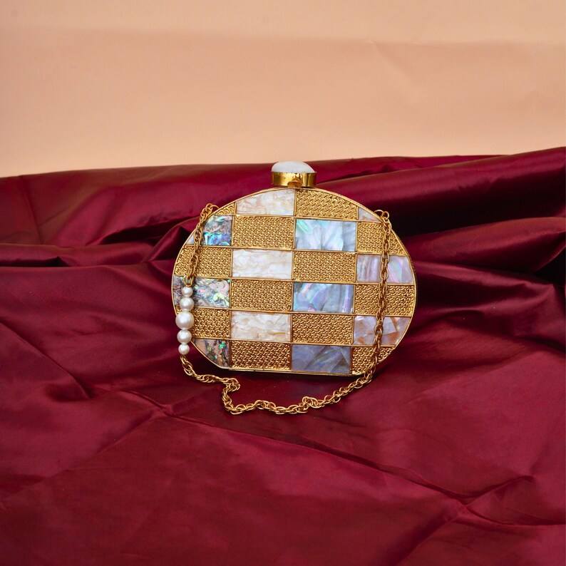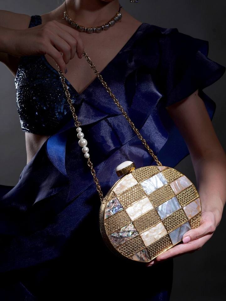 2025 Top Selling Designer Luxury Handmade Handbag Brass Embellished Clutch with Mother of Pearl Unique Pattern Purse