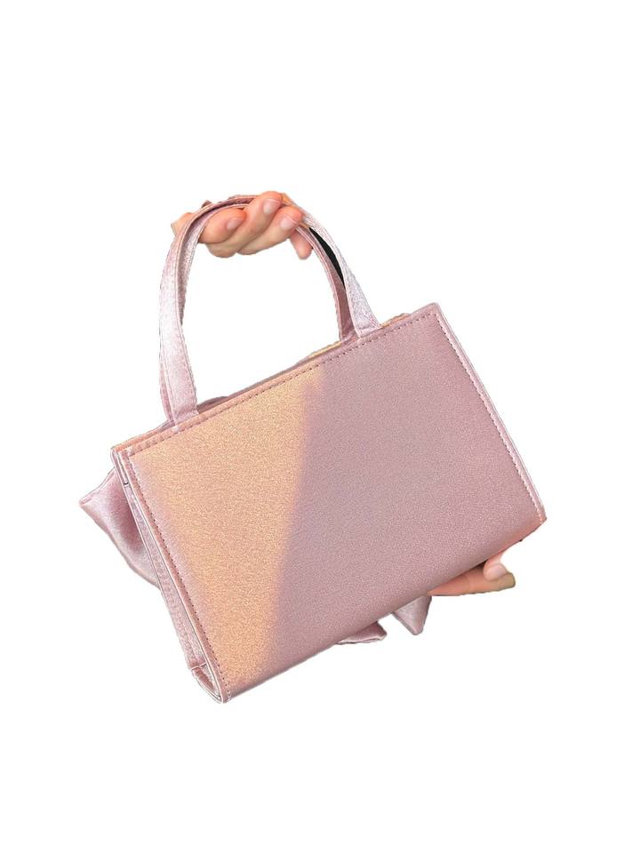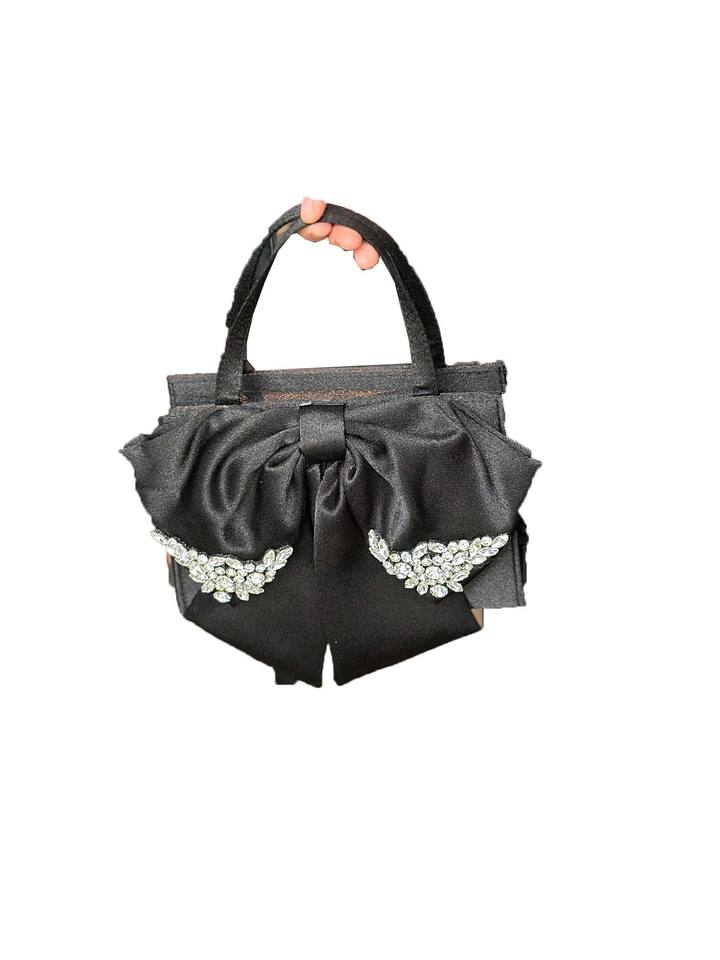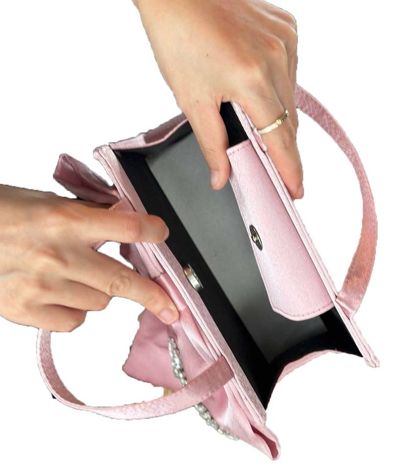 Elegant satin evening bag with bow and rhinestones, shoulder bag for a dress with floral embroidery