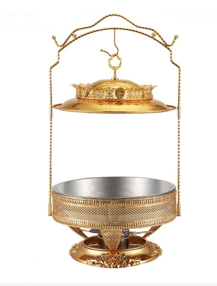 Elegant shine of metal chafing dish with designer hanging lid enhances food presentation and guest appeal