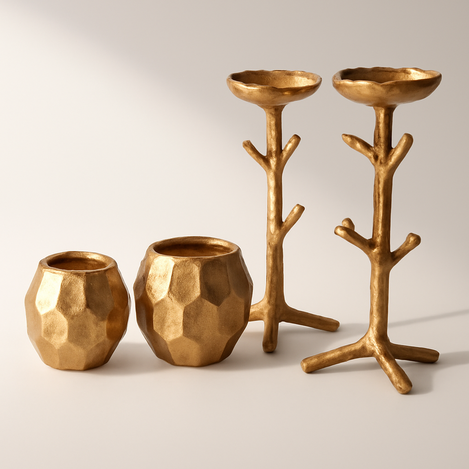 Elegant tall gold metal candle holder classic candlestick stand with sculpted stem and round decorative home wedding centerpiece