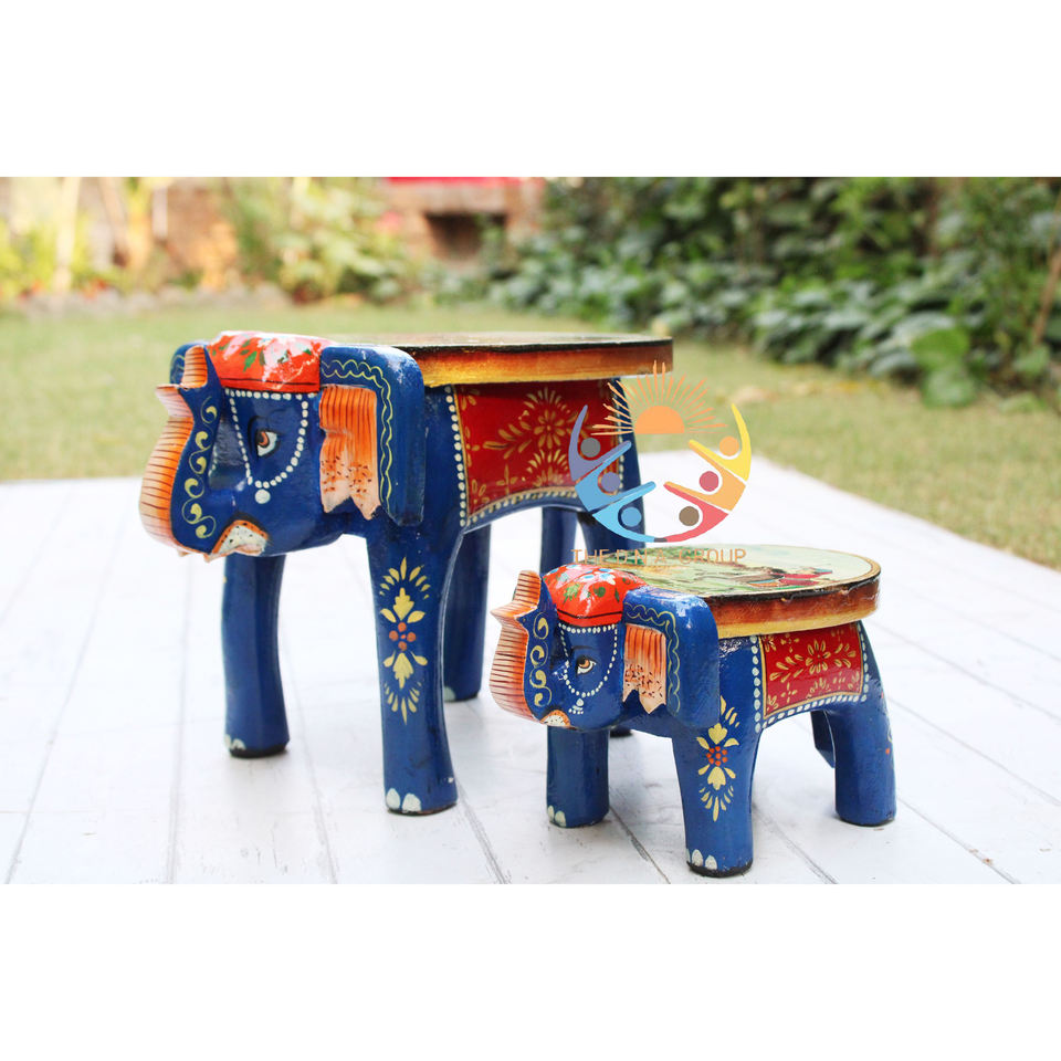 Handcrafted Wooden Elephant Stool Set with Rajasthani Hand Painting