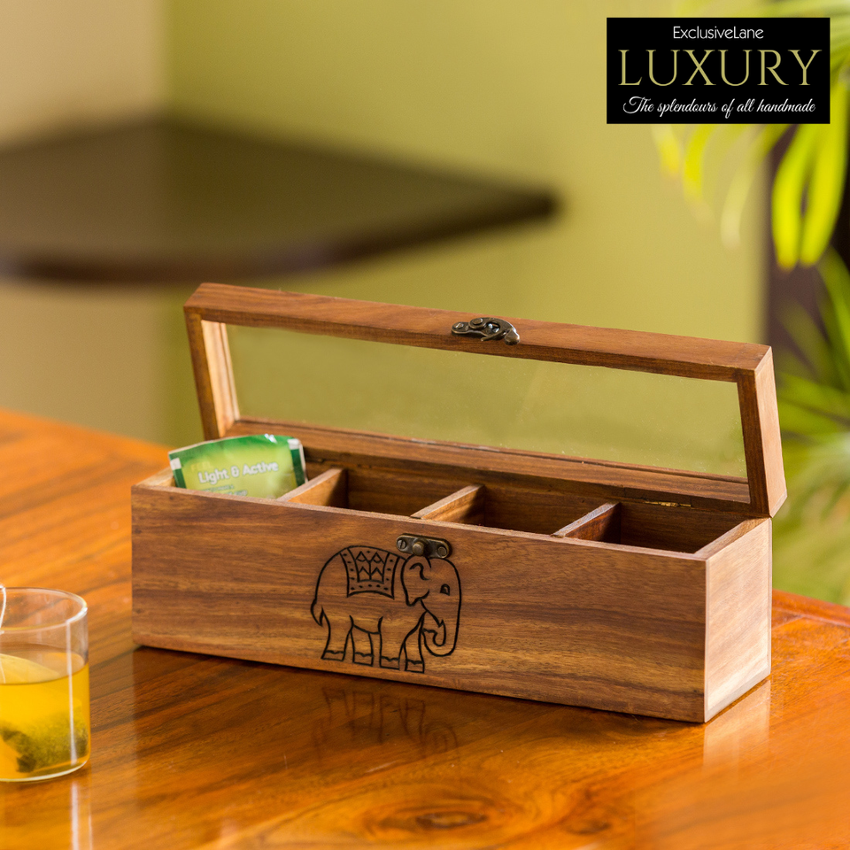 Elephant Warriors Carved Sheesham Wood Tea Box 4 Compartment Multi-Utility Decorative Storage