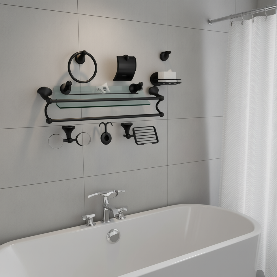 Elite 7-Piece Towel Rack Set Black Zinc Alloy Double Rod Glass Shelf Bathroom Accessories