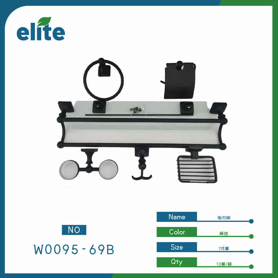 Elite Towel Rack 7-Piece Set Black Zinc Alloy Wall Mounted Bathroom Hardware With Glass Shelf And Double Rods