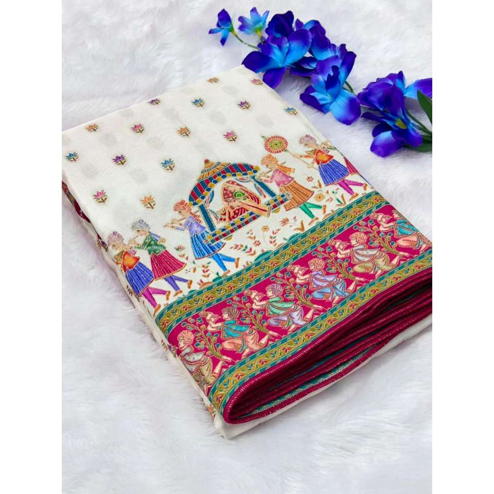Elite Weaves Pure White Darbari Saree Traditional Position Printed Viscose Silk Indian & Pakistani Clothing