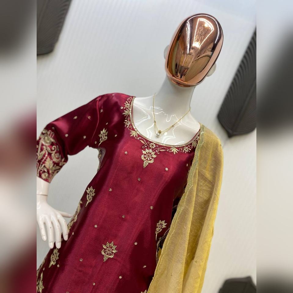 Elite silk salwar kameez with heavy thread work top and bottom with dupatta pair for festive season boutique style