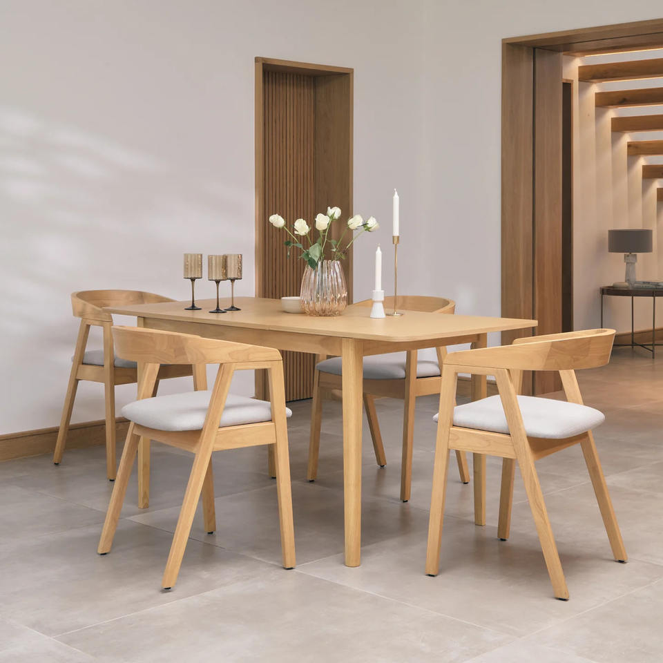 Ella Boucle Dining Chair Set of 4 chairs with teak wood legs and cushion seats
