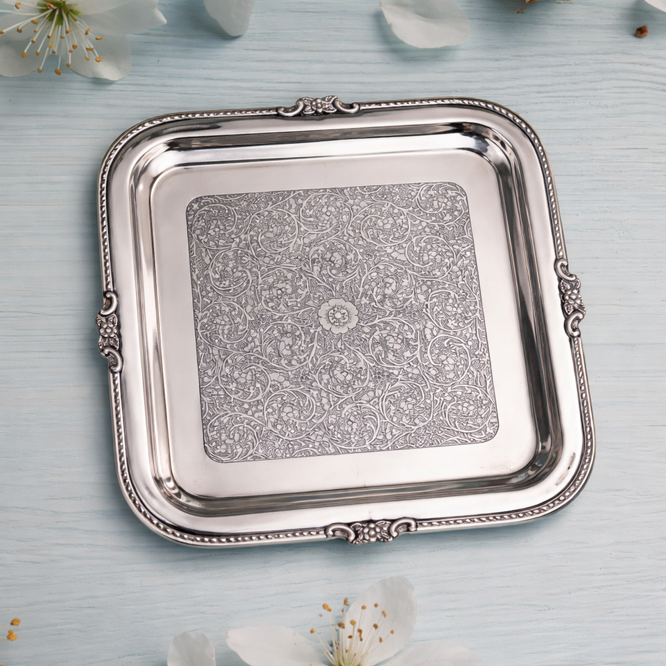 Embossed serving tray Engraved silver tray Ornamental serving platter Rectangular serving tray Vintage style tray