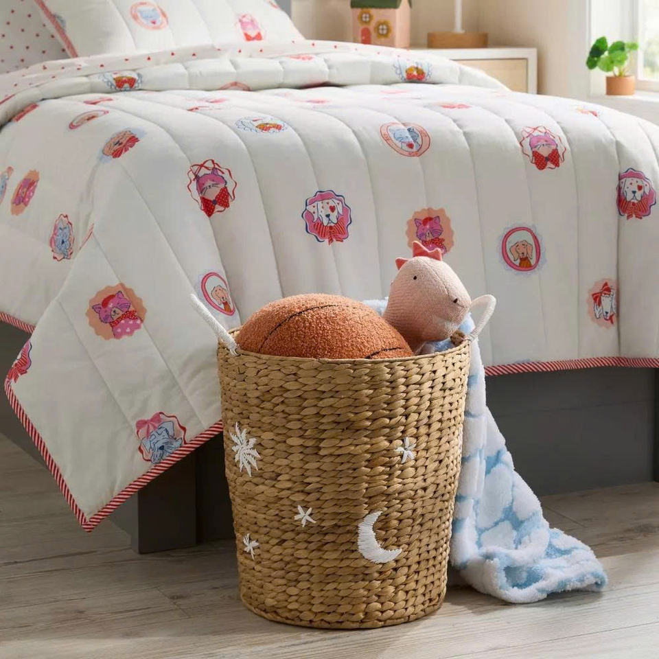 Embroidered Basketball & Soccer Wicker Storage Bin for Boys Room Sports-Themed Handcrafted Water hyacinth Laundry Hamper