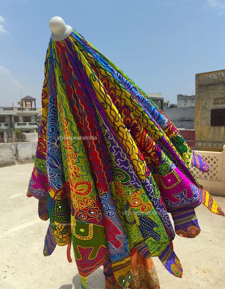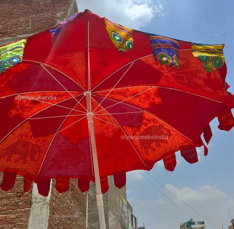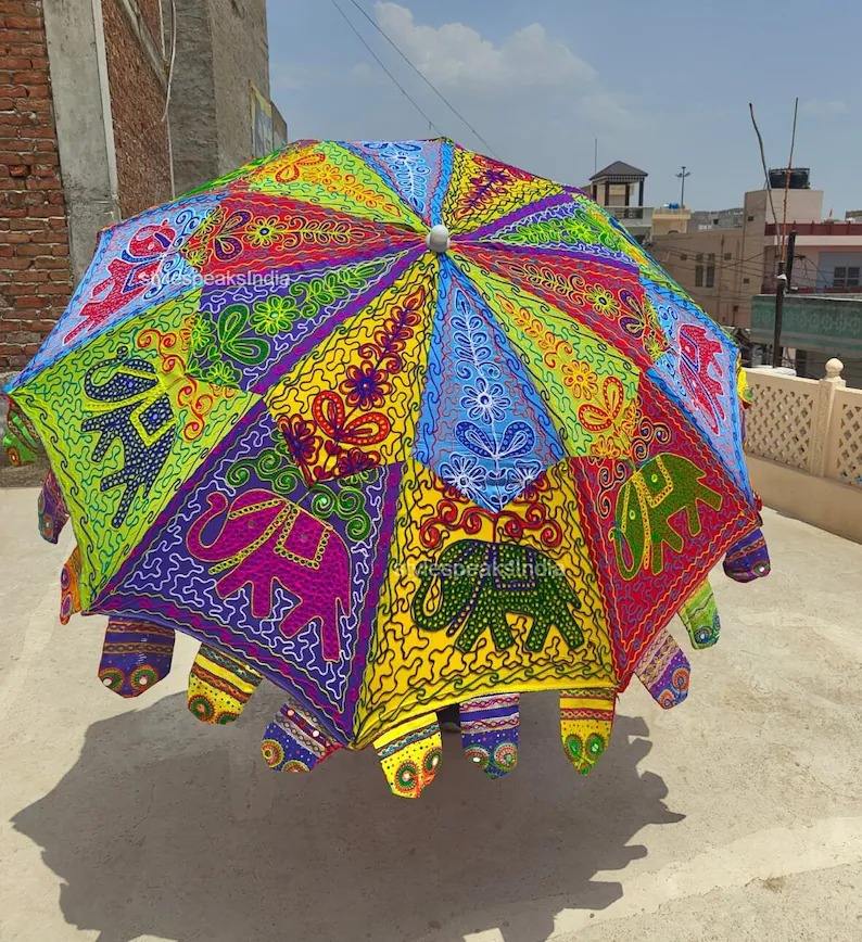 Embroidered Big Umbrella Indian Coton Handmade Decorative MultiColor Elephant Print Garden Parasol Boho SunPatio Decor Gift Idea