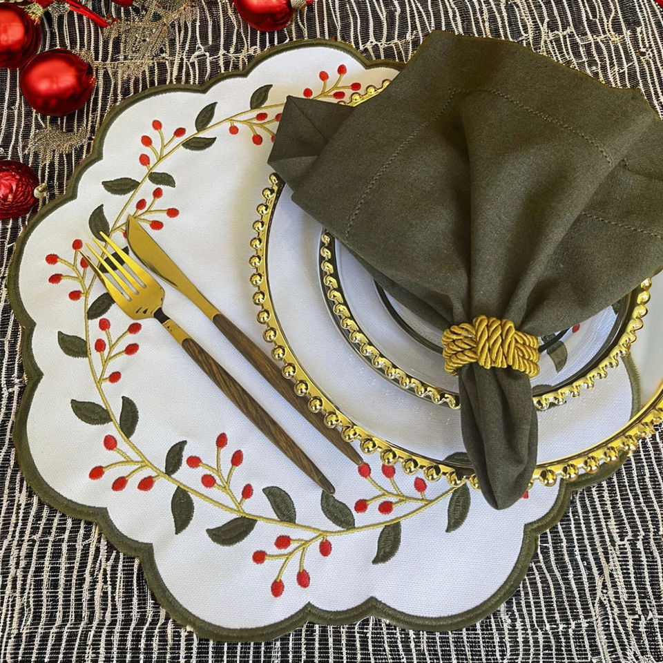 Embroidered Christmas Design Round Placemat& Napkin Set Green Scallop Border White Cotton Mats for Home Restaurants Events