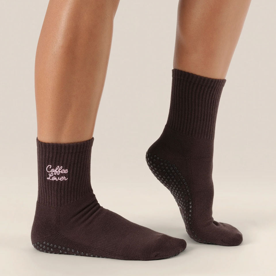 Embroidered Grip Pilates Yoga Cotton Crew Socks for Women Studio Training Coffee Theme Anti Slip Socks
