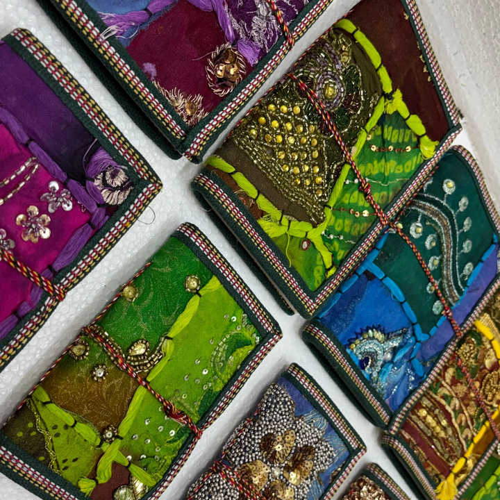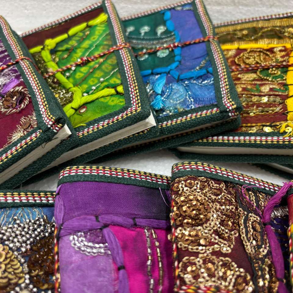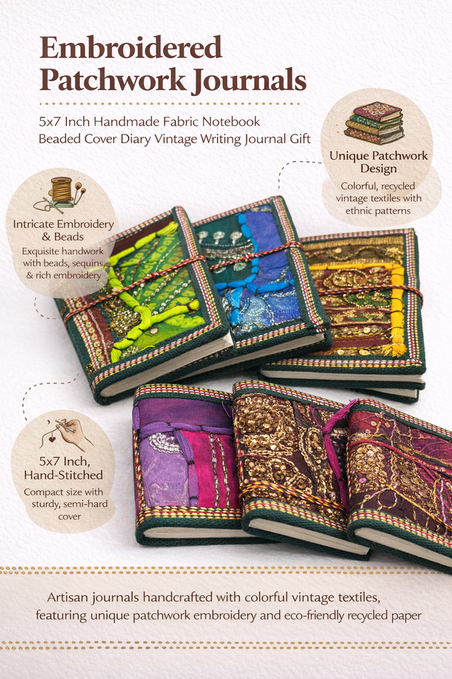 Embroidered Patchwork Cotton Journal 5x7 Inch Handmade Silk Screen Printed Fabric Notebook Beaded Cover Diary Vintage Textile