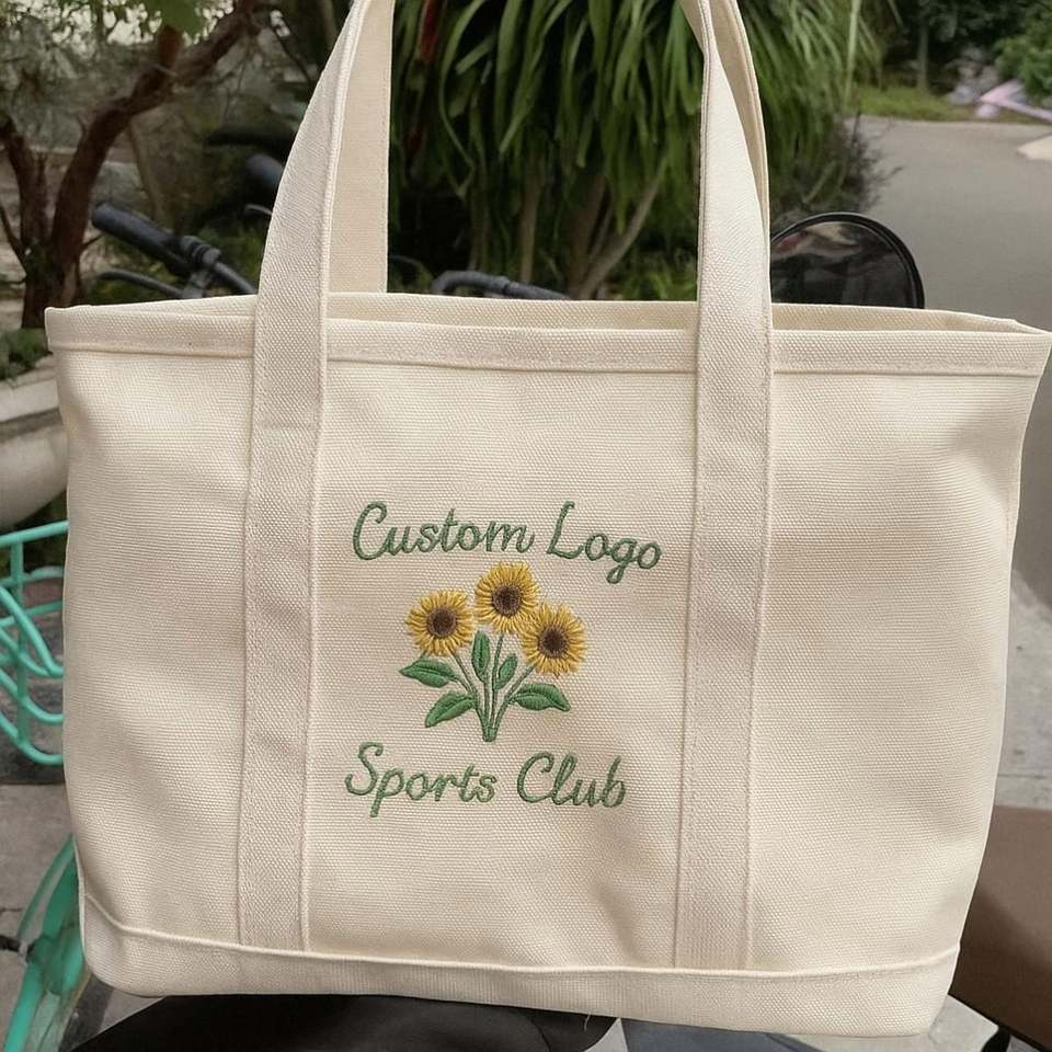 Embroidery Cotton Canvas Reusable Customized Letter Logo Two-Tone Accent Sporty Gusseted Tote Bag With Pocket