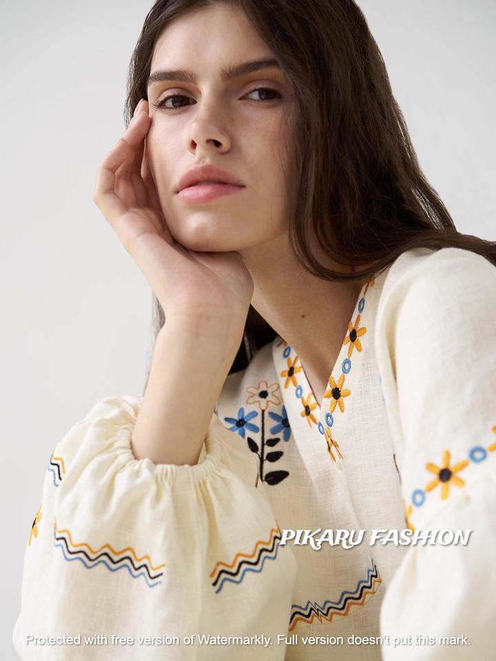 Embroidery Long Puff Sleeve V-Neck Designer Fashion Embroidered Top Trendy Explosive Dress Ukraine Blouse