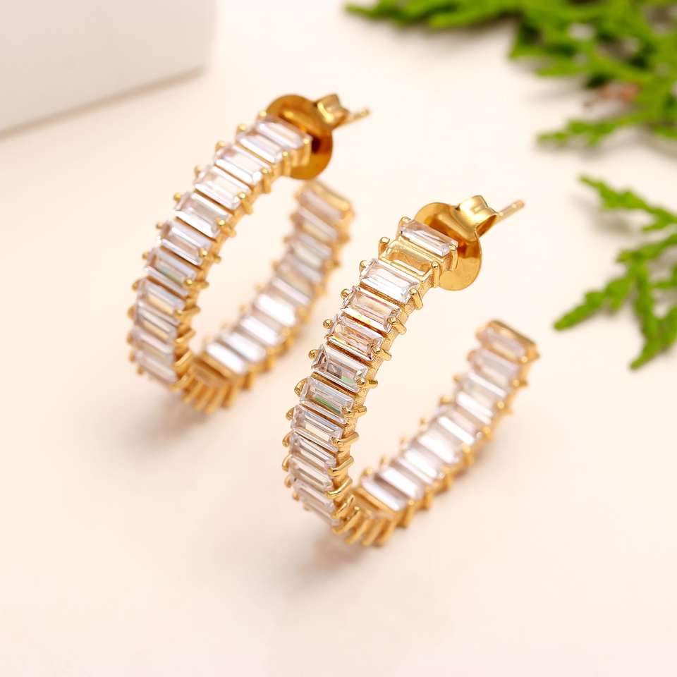 Emerald Cut Cubic Zircon Huggie Hoop Earrings Gold Plated 925 Sterling Silver Hoop Studs Screw Back Gold Zircon Hoop Earrings