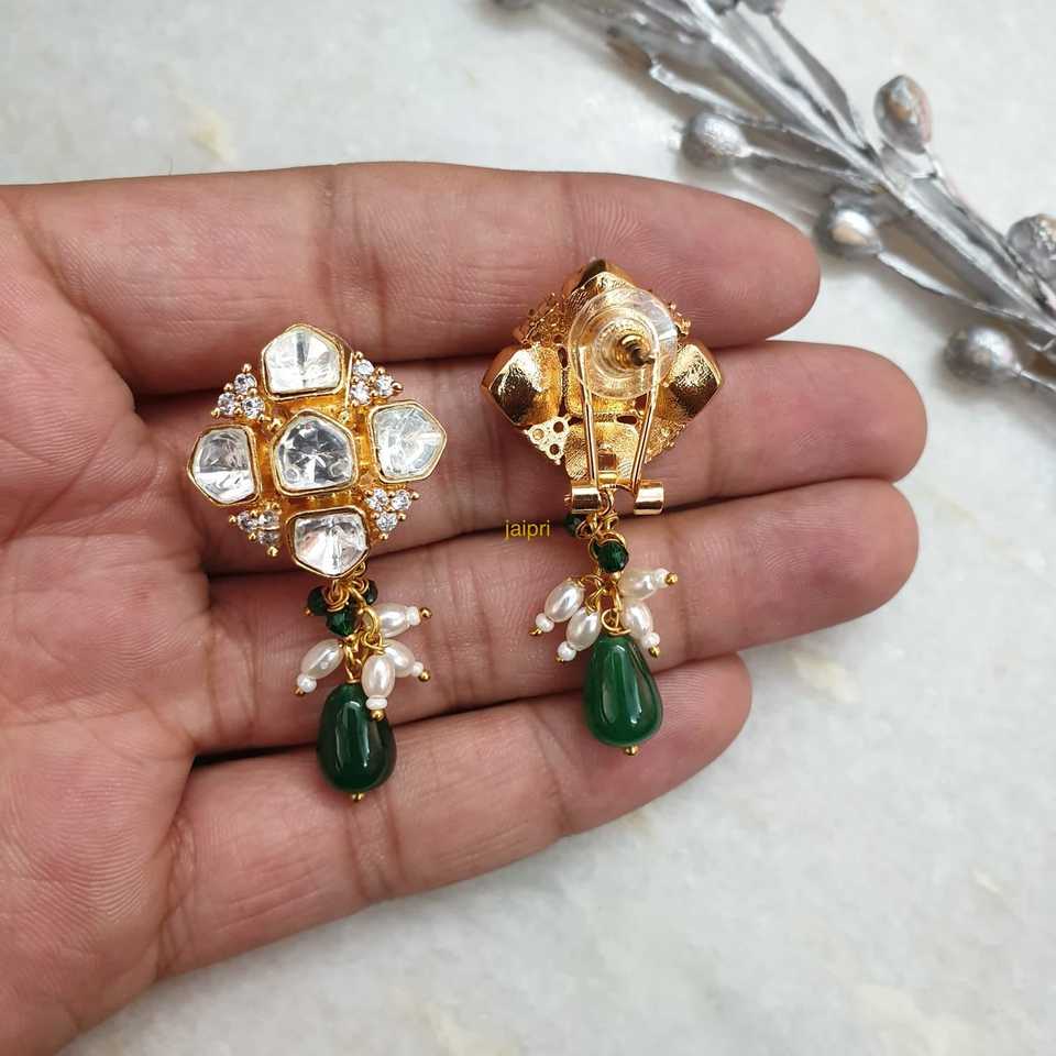 Emerald Green Moissanite Kundan Polki Studs Fashionable Stud Earrings