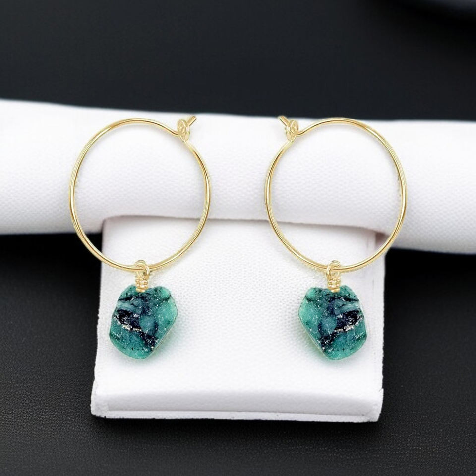 Emerald Raw Birthstone Hoop Earrings Jewelry - Handmade Wired Hoops - Gold Plated Hoop 925 Silver Earrings For Women