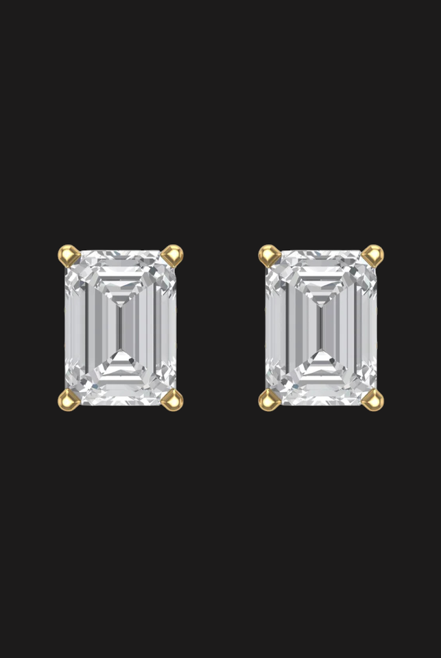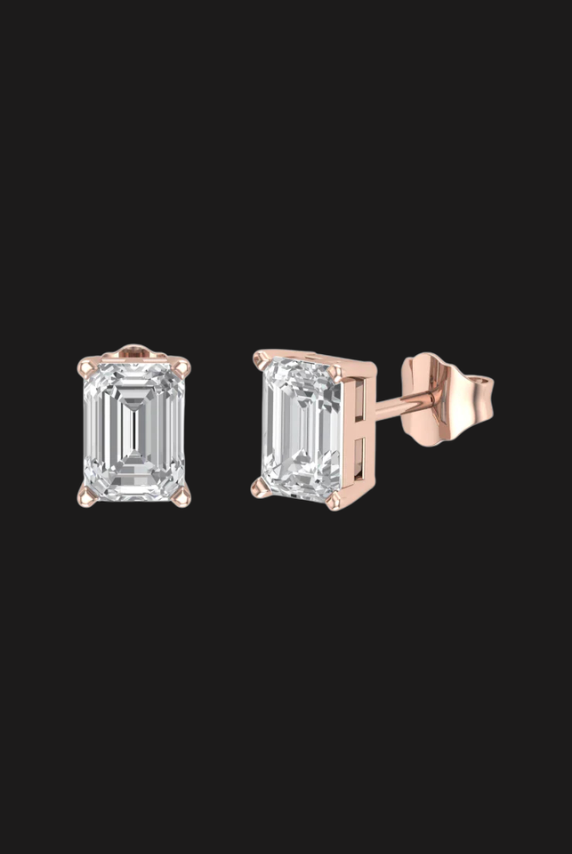 Emerald cut moissanite stud earrings in rose gold setting crafted for modern elegance with subtle hip hop inspired shine