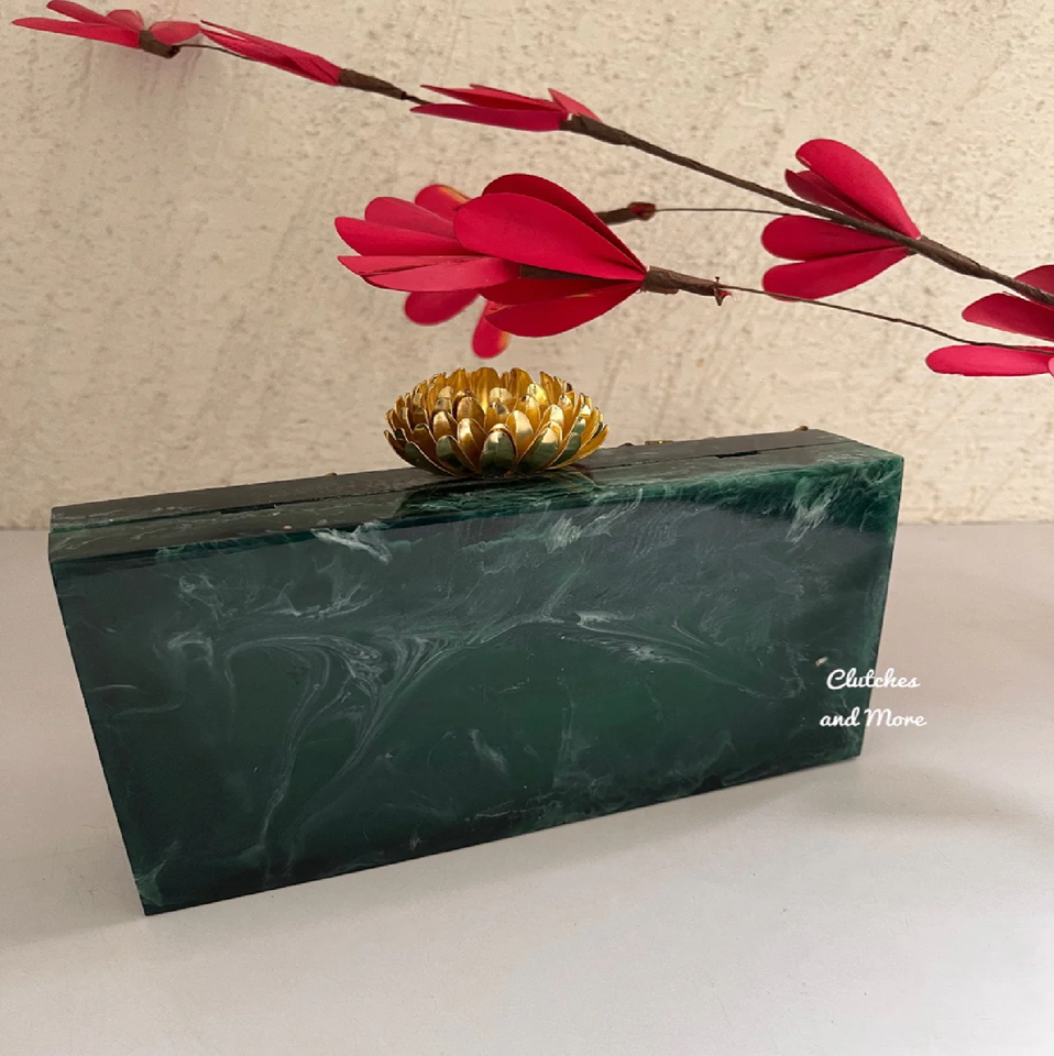 Emerald green marbled box clutch with a golden lotus-shaped clasp Available at Wholesale Stock Garden Ornaments