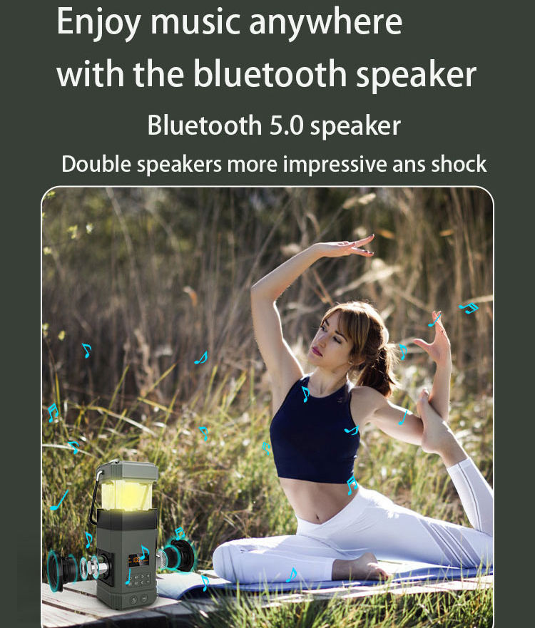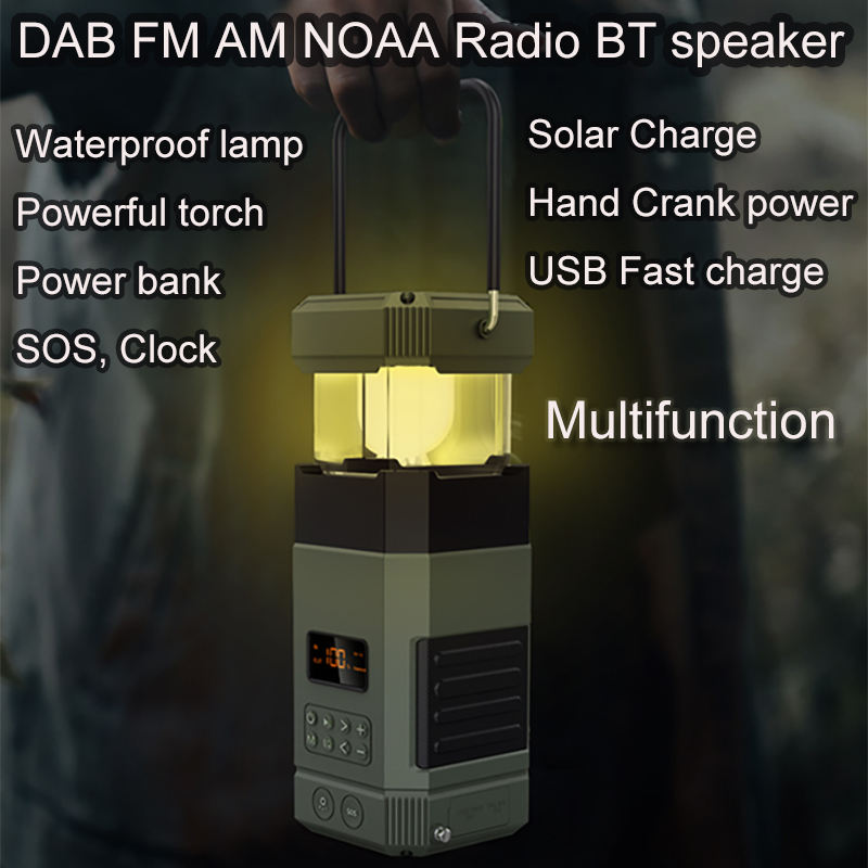 Function:Radio, Speaker, lantern, power bank, SOS survival, lighting
