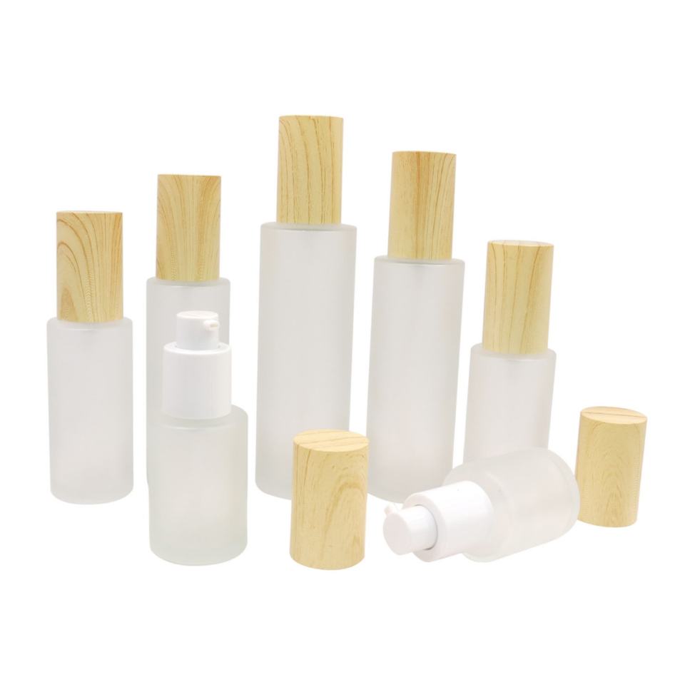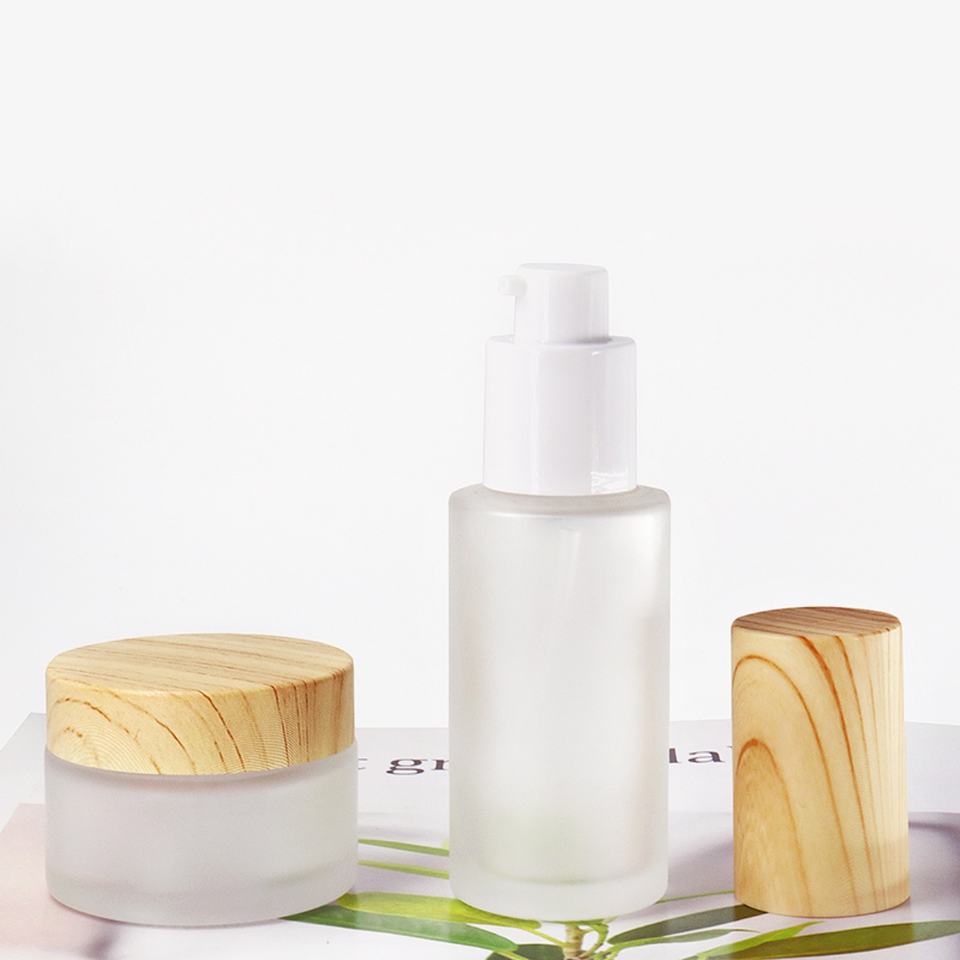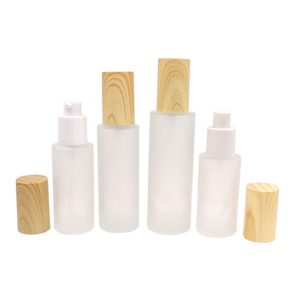 Empty Refillable Frosted Glass Cosmetic Cream Lotion Pump Bottles With Wood Grain Lid for Emulsion Essence Liquid