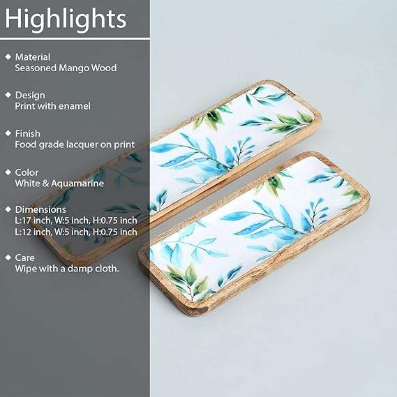 Eco-Friendly 17-Inch X 5-Inch Enamel-Coated Mango Wood Printed Tray Snack Dining Table Serving Platter for Kitchen or Camping