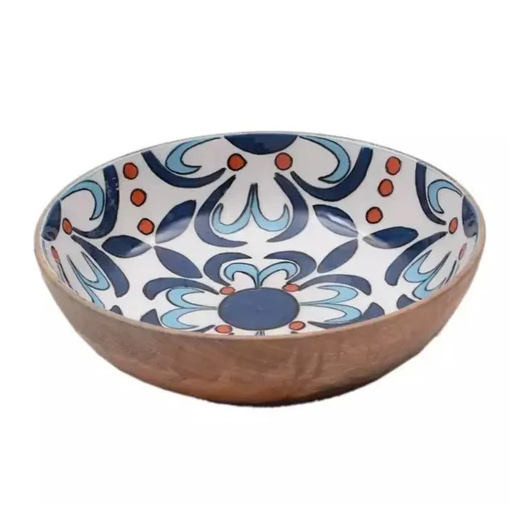 Enamel Printed Wood Bowl Customized Eco-Friendly Wood Serving Bowl Heavy Quality Printed Blue Design Bowl