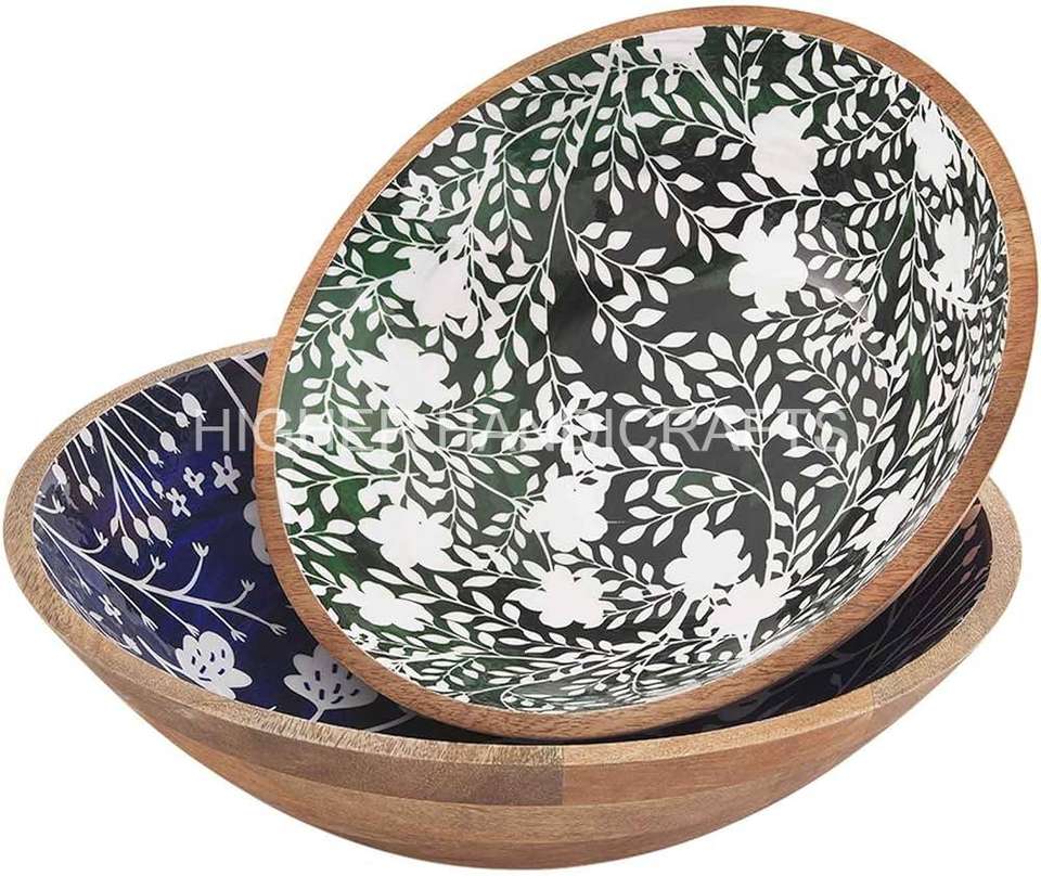 Eco-Friendly Premium Mango Wood Enameled Printed Bowls Decorative Dough Dinner Bowls