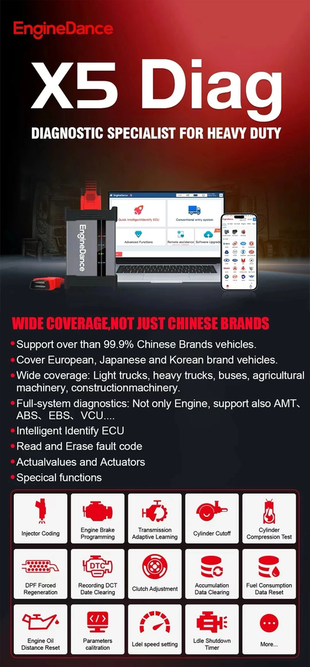 EngineDance X5 Diag 2-in-1 Truck Diagnostic Tool ECU Programmer Heavy Duty Trucks Diesel Coding Key Programming