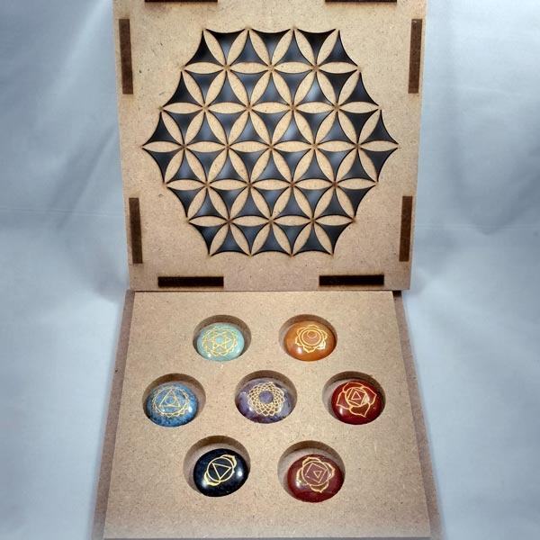 Engraved 7 Chakra Set Oval Shape High Quality MDF Chakra Kit Box Agate Star Gemstone Religious Carved Cross Love