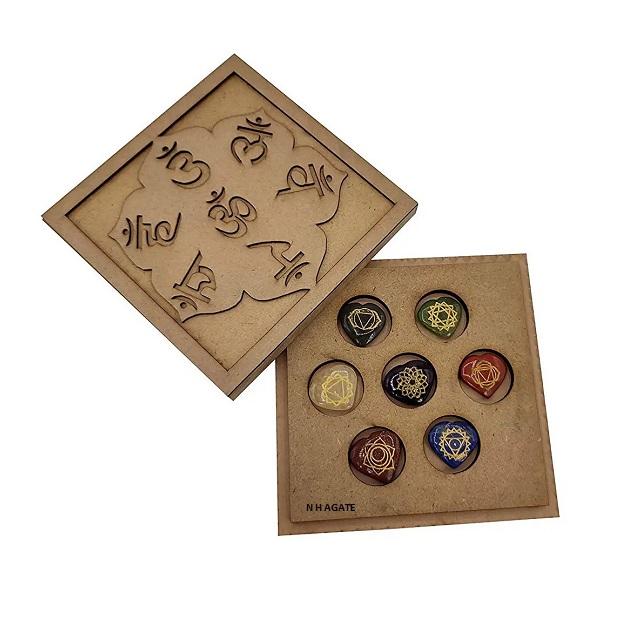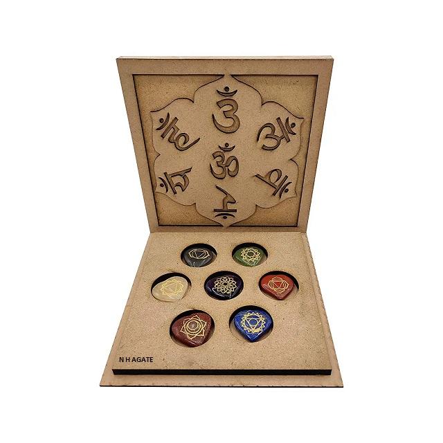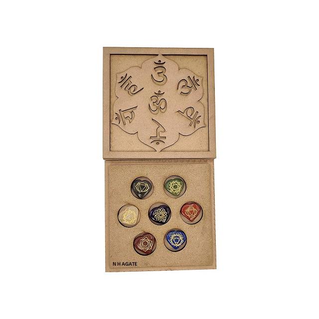 Engraved Chakra Stone Reiki Healing Crystal Seven Chakra Reiki Set With Wooden Box: Healing Reiki Agate 7 Chakra Set With Box