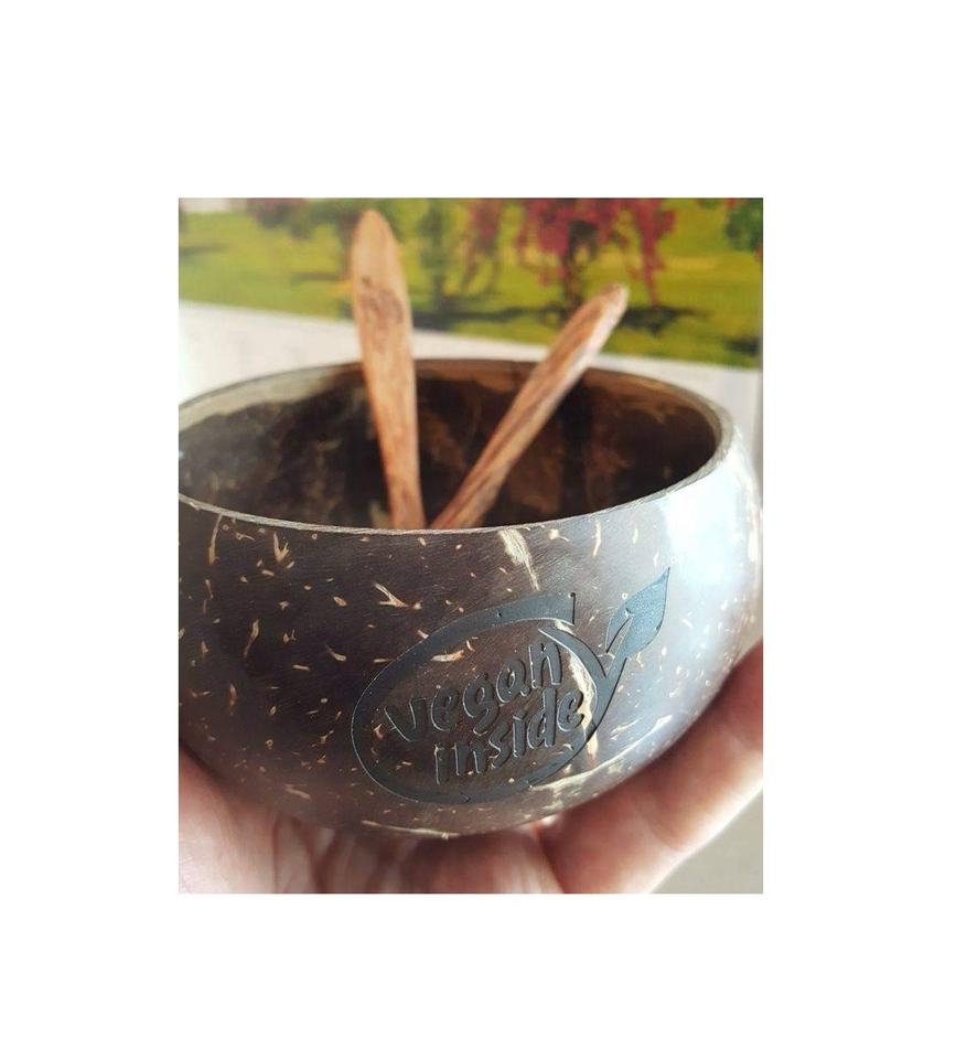 Engraved and Personalized Natural Coconut Bowls and Wooden Fork Spoon for Flatware Kitchenware Wedding Party Food Service