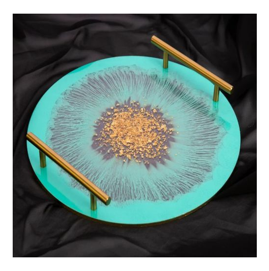 Epoxy Resin Serving Tray Most Selling Round Shape Silver Glitter With Brass Handle Top Attractive Design Resin Serving Tray