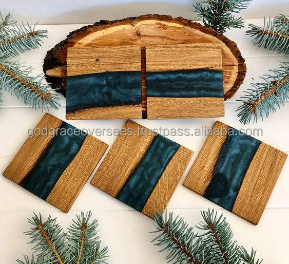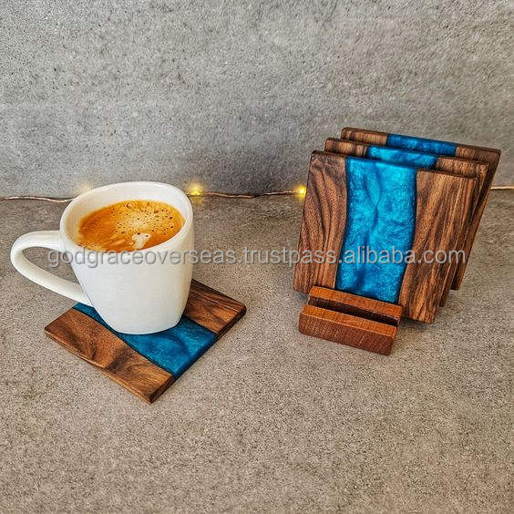 Epoxy Resin Square Coaster and Wood Stand Eco Friendly Luxury Solid Wood and Epoxy Resin Craft Tea Drink Cup Free Coasters