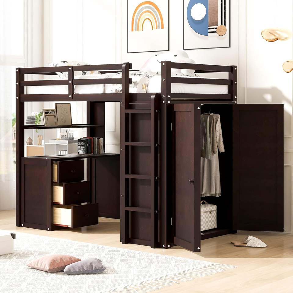 Espresso Traditional Twin Size Loft Bed 3 Storage Drawers Study Desk Wardrobe Safety Ladder for Kids/Teens Solid Wood