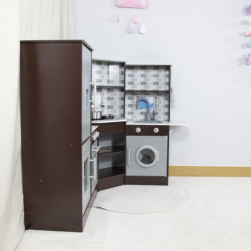 Espresso Wooden Corner Play Kitchen Set for Kids with Refrigerator, Oven, Microwave, Sink & Washing Machine, Pretend Play Toy