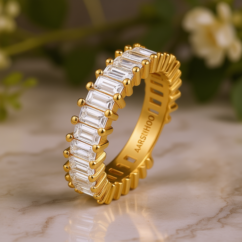 Eternity Band Ring For Women, Gold Plated Copper With Lab Created Emerald Cut Cubic Zirconia, Channel Setting, Glam Wedding Enga