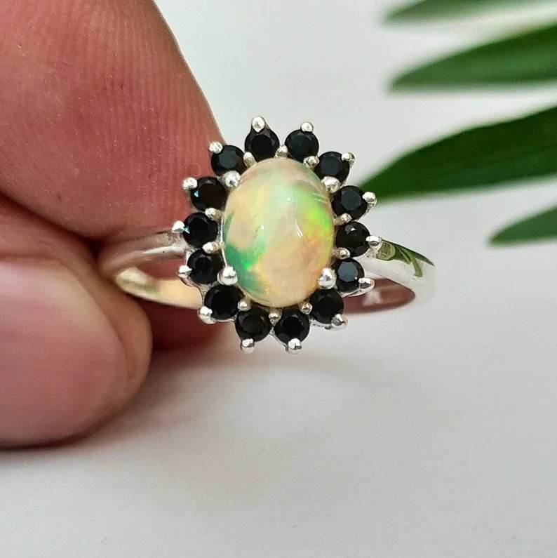 Ethiopian Opal Stone Ring for Women Solid 925 Sterling Silver Unique Design Wedding Engagement Christmas Gift Oval Cut Diamond