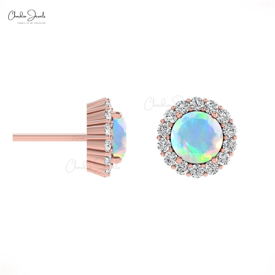Ethiopian Opal Studs Earring Surrounded White Diamond Earrings 14K Solid Gold 4mm Round Gemstone Stud Earring at Wholesale Price