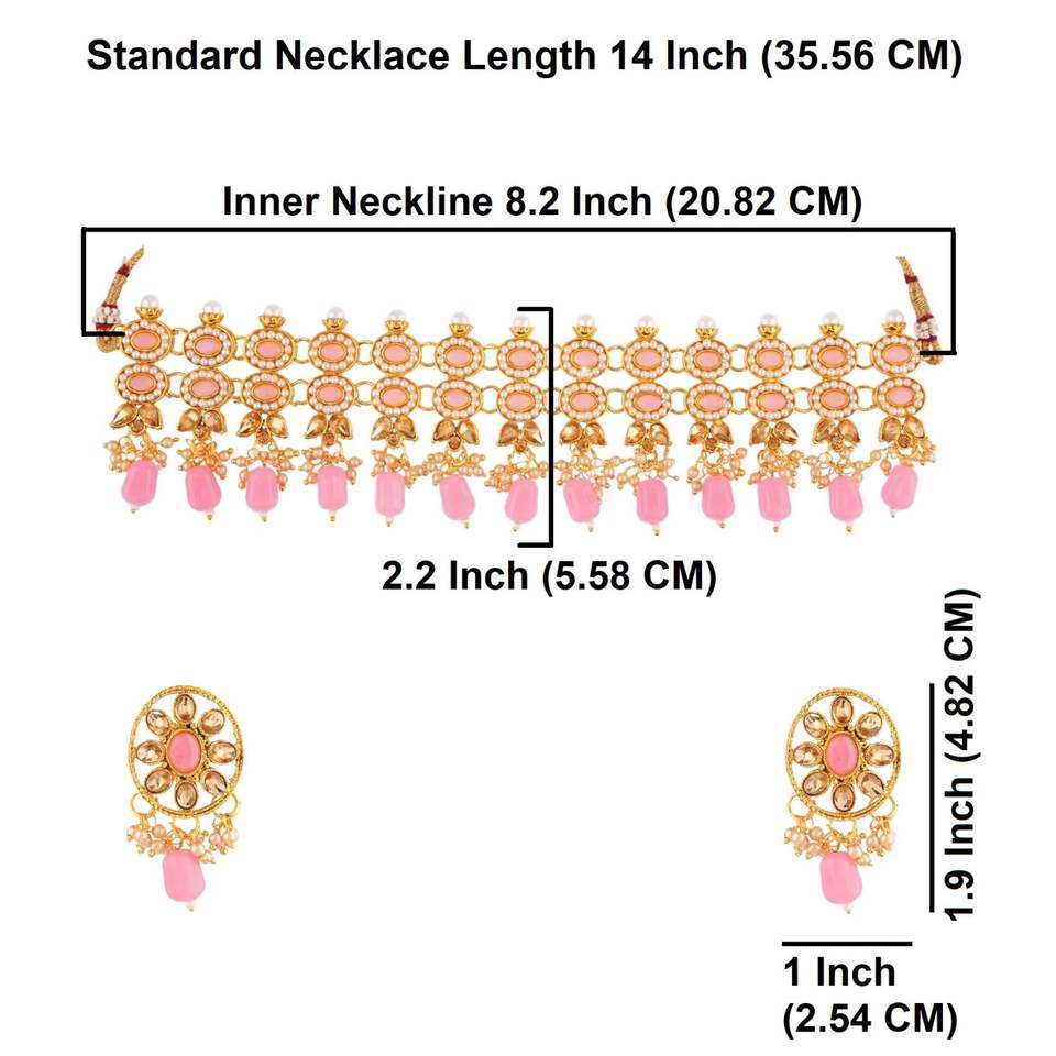 Ethnic Designer Floral Faux Pearl Crystal Choker Necklace Bridal Wedding Dangle Earring Indian Jewellery For Women, Pink