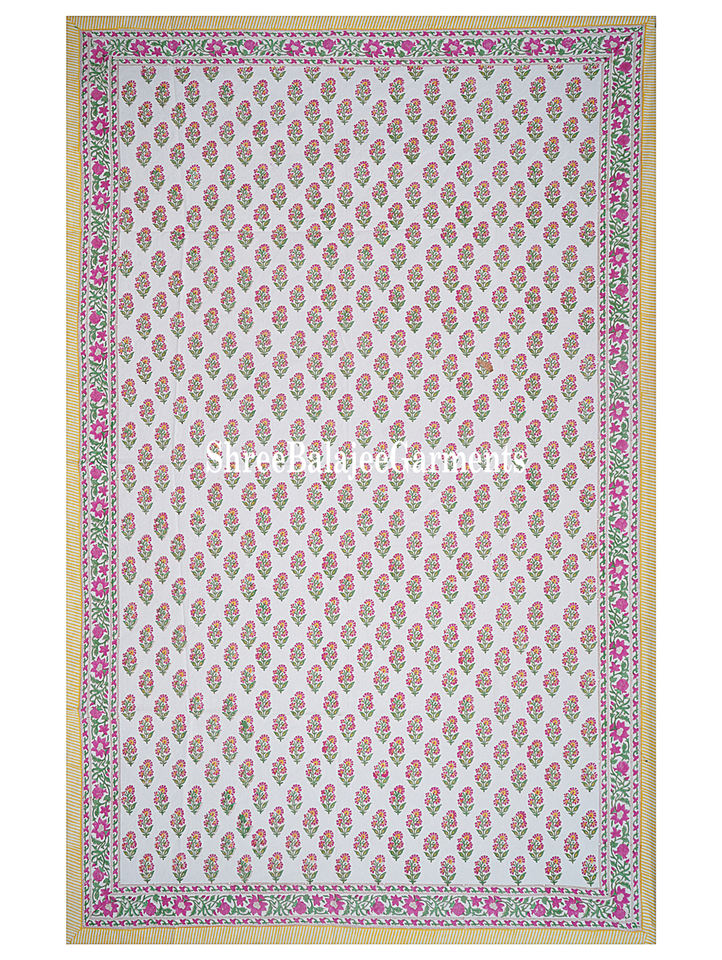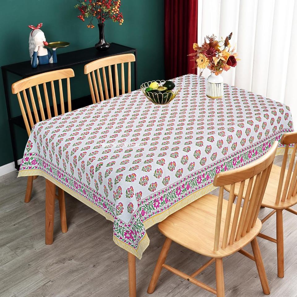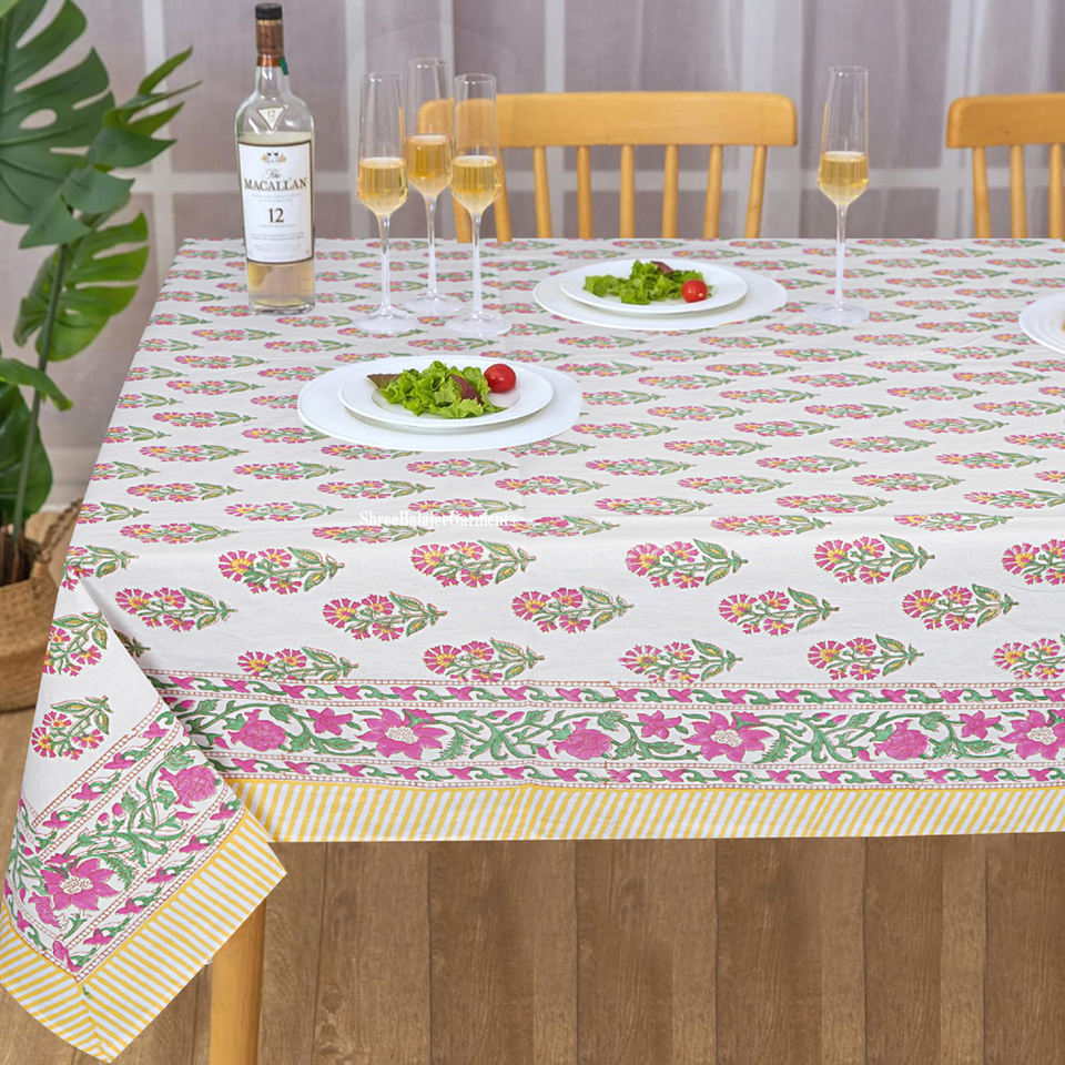 Handmade Pink Floral Pattern Indian Traditional Block Print Tablecloth Artisan-Delivered for Wedding Home Use Ethnic Dining