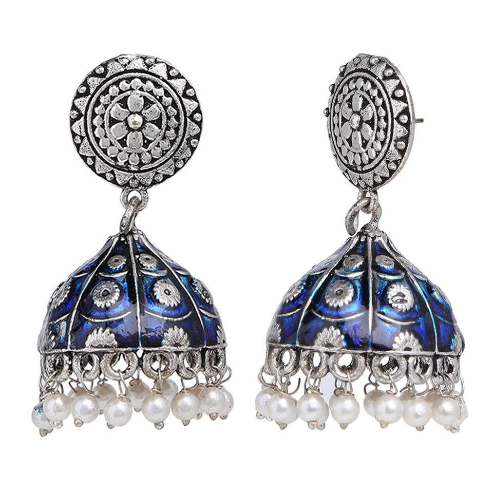 Ethnic Gypsy Tribal Indian Oxidized Silver Pearl Tassel Jhumka Dangle Drop Earrings Jewelry