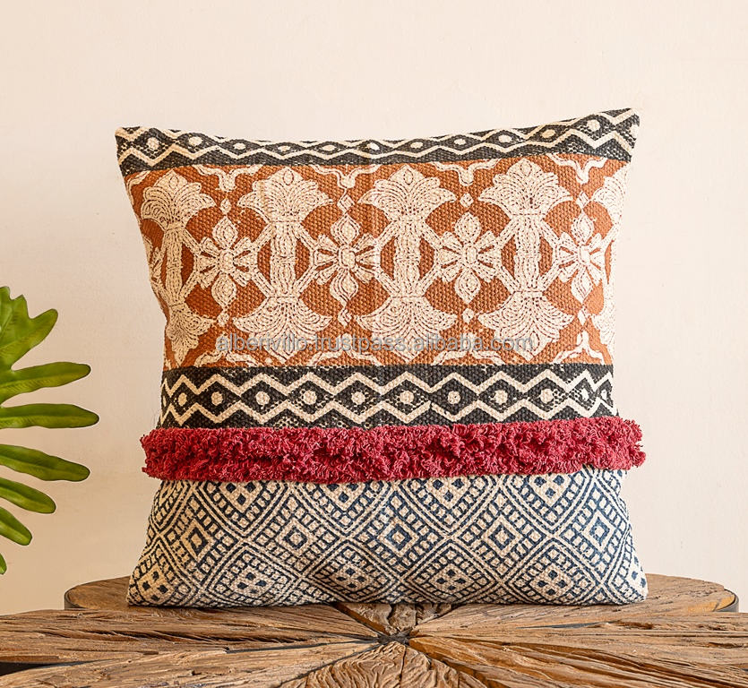 Ethnic Indian Hand Block Printed Pillow Cover With Tufted Geometric Patterns For Home Styling Printed Pillowcase