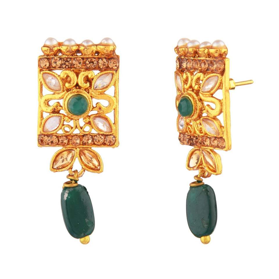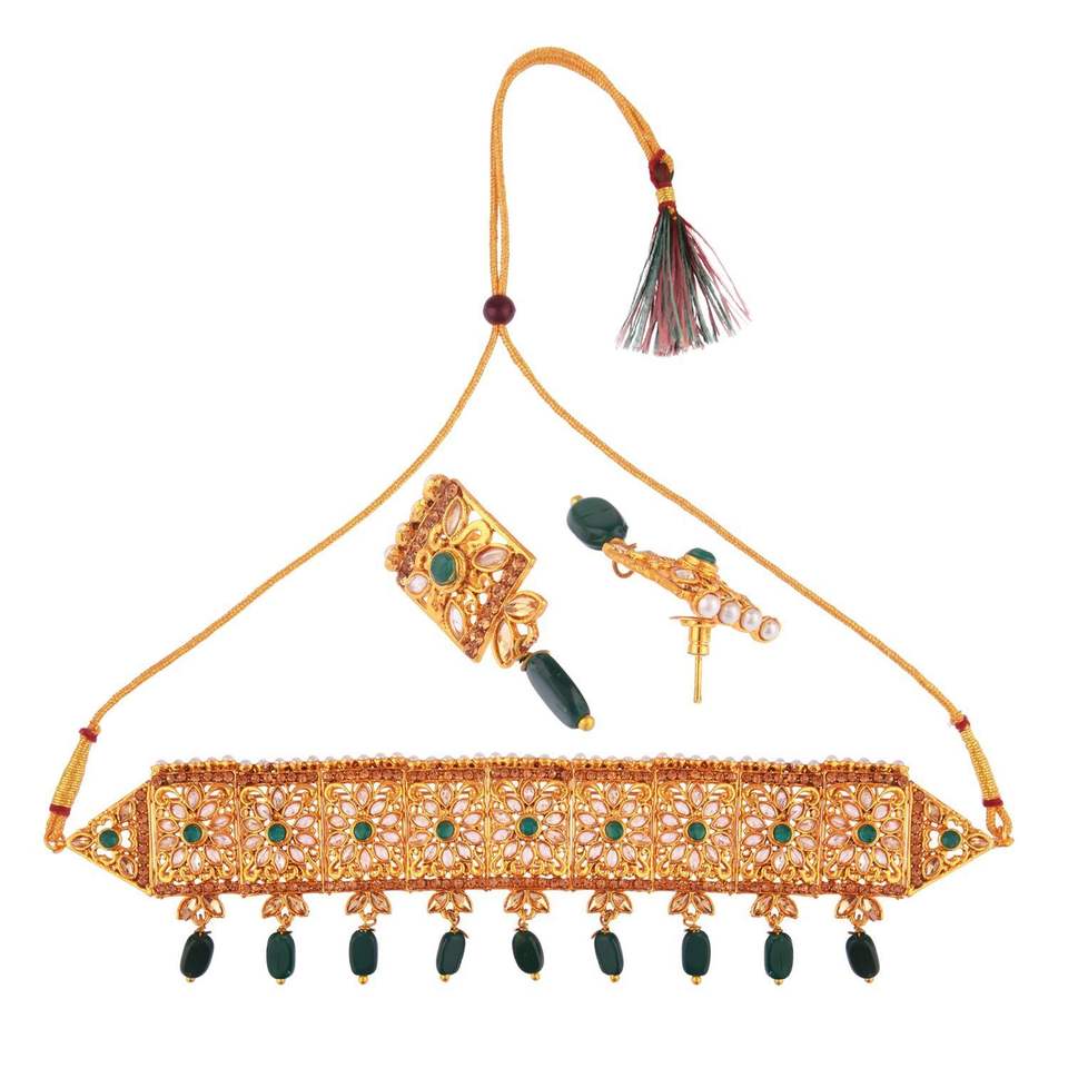 Ethnic Indian Traditional Jewellery Manufactures Faux Pearl Kundan Choker Necklace Stud Earrings Necklace Set, Green