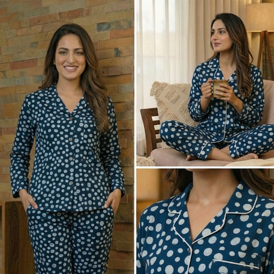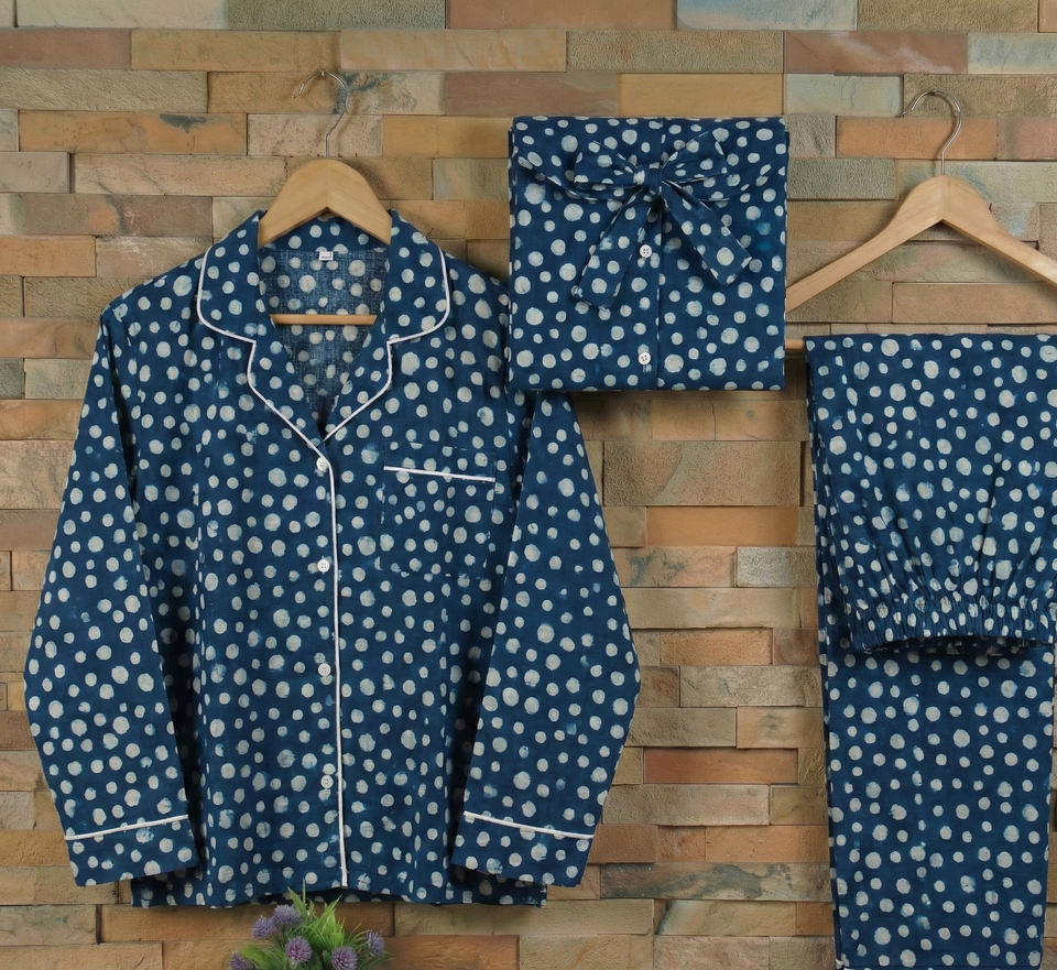 Ethnic Indigo Cotton Two Piece Women Sleep Clothing Artistic Handcrafted Lounge Apparel Supplier India